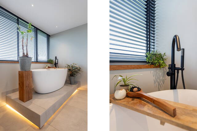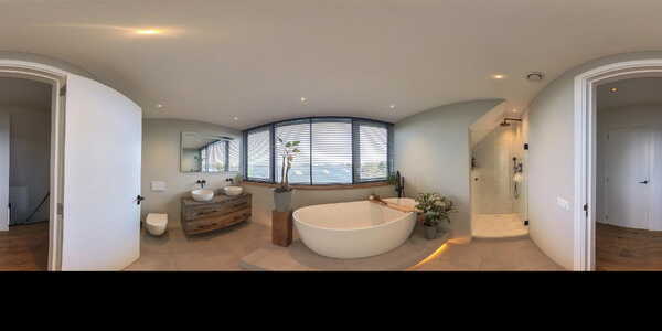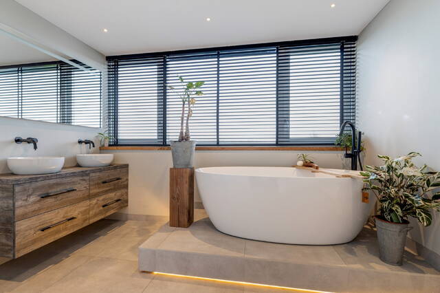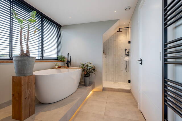 De tweede badkamer is een luxe oase met een verhoogd vrijstaand ligbad (met indirecte verlichting aan de onderzijde), inloopdouche, hangend toilet en dubbel wastafelmeubel met verlichte spiegel. De ruimte beschikt over dimbare inbouwspots en een dakkapel die extra licht en ruimte biedt.