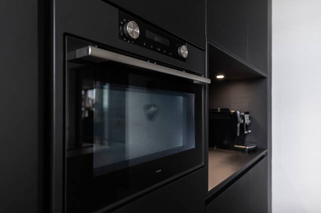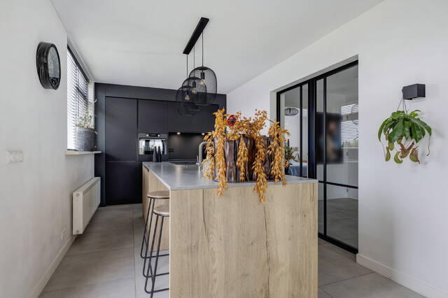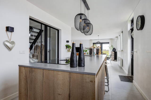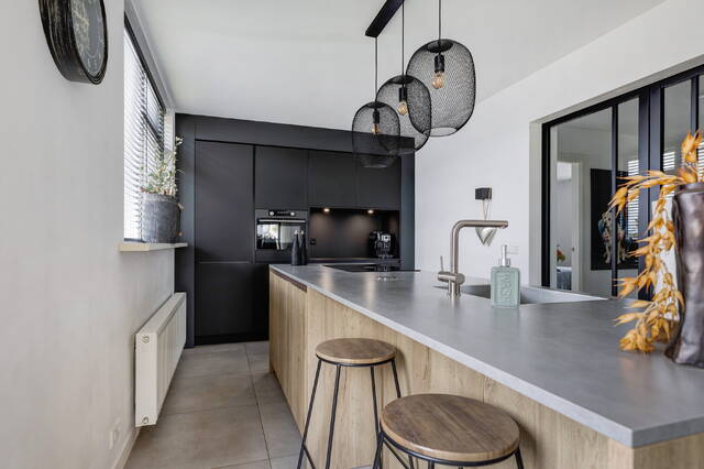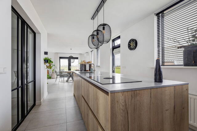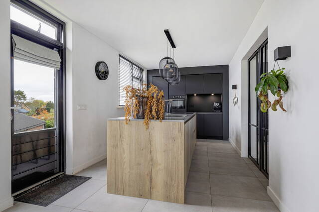 De open keuken vormt het hart van het huis en is uitgevoerd in een stijlvolle combinatie van zwart en houttinten. De wandopstelling biedt veel kastruimte, een koel-vriescombinatie, combi-oven en een nis met coffeecorner en verlichting. Het kook-/spoeleiland met composiet werkblad in betonlook is voorzien van een Bora inductiekookplaat met geïntegreerde afzuiging, vaatwasser, spoelbak en een gezellige eetbar. Vanuit de keuken is er middels een trap toegang tot het achtererf met de loods en oprit.