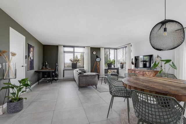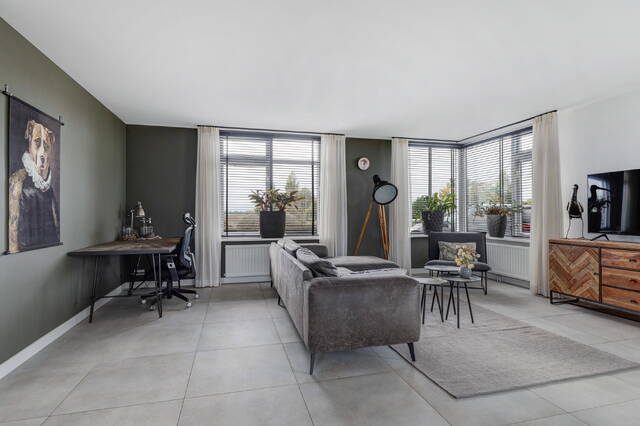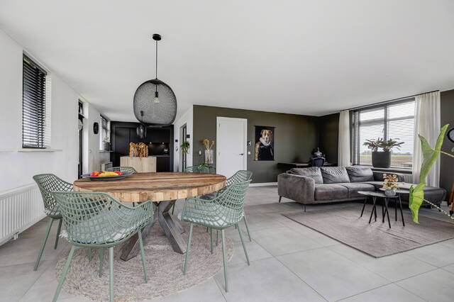De woonkamer is een heerlijke, lichte ruimte met ramen rondom en een adembenemend uitzicht over de polder. Via openslaande deuren bereikt u het terras op dijkniveau, afgewerkt met houten vlonders, dé plek om te genieten van zon, uitzicht en rust.