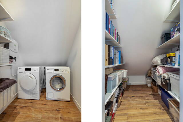 De wasruimte heeft plaats voor wasmachine, droger en de omvormer van de zonnepanelen, terwijl de CV-ruimte en inloopkast extra praktisch gemak toevoegen.